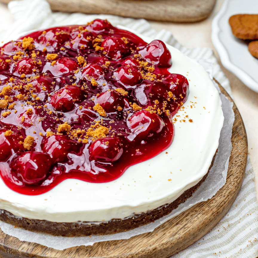 Vegan MonChou taart is helemaal niet moeilijk om te maken. Het recept lijkt op deze basis MonChou taart, maar we vervangen wat van de ingrediënten zodat die volledig vegan is! De bodem van de taart maak ik van gemalen speculooskoekjes met plantaardige boter. Deze druk ik plat op het bakpapier op de bodem van de springvorm. Daarna maak ik het mengsel van plantaardige roomkaas met vanillesuiker en poedersuiker. Deze verdeel ik over de koekjesbodem en ik laat het geheel lekker lang opstijven in de koelkast (minimaal 4 uur, maar langer is beter).  Wanneer de vegan MonChou taart stevig aanvoelt kun je de springvorm eraf halen en de kersen erop doen.