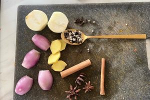 2. Voeg de ui, sjalotten, knoflook, gember, kaneelstokje, peperkorrels, kruidnagels en steranijs toe en bak 2-3 minuten droog op hoog vuur. Blijf het goed doorroeren. Voeg vervolgens de olie toe en bak nog 1-2 minuten door.