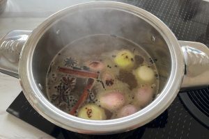 3. Giet de groentebouillon in de pan, breng aan de kook, zet het vuur lager en doe de deksel op de pan. Laat de bouillon minimaal een halfuur koken zodat de smaken er goed in trekken.
