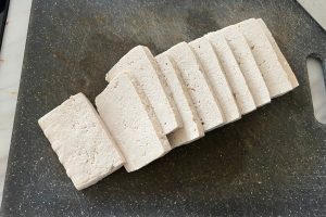 4. Bereid in de tussentijd de tofu. Haal de tofu uit de verpakking en dep het droog met een schone theedoek. Snijd het blok daarna in plakken van 0.5-1 cm dik en bedek ze met de maïzena.