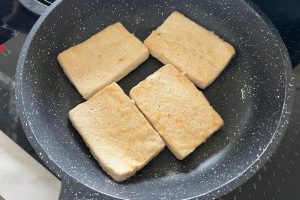 5. Verhit wat olie in een koekenpan op middelhoog vuur. Leg de tofu, bedekt met maïzena, in de pan, bestrooi met zout en peper en bak tot de onderkant goudbruin is, ongeveer 3-4 minuten. Keer dan om en bak aan de andere kant ook goudbruin. Heerhaal dit tot alle tofu gebakken is.