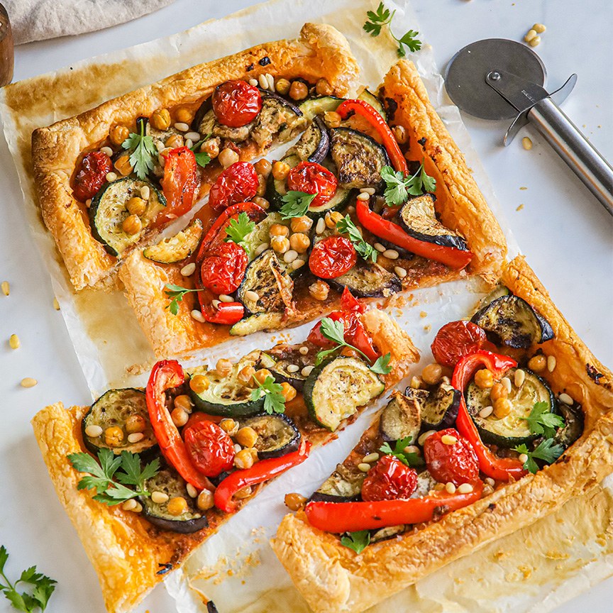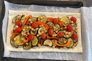 6. Verdeel de rode pesto over de plaattaart en verdeel daarover de gebakken groenten en de cherrytomaatjes.