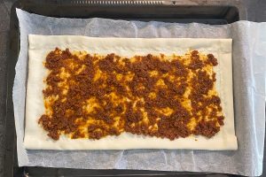 2. Rol het vel bladerdeeg met bakpapier uit en leg dit op de bakplaat. Vouw 1-2 centimeter van de randen om en druk het aan met je vingers. Prik met een vork gaatjes in de bodem en bak de plaattaart 5-10 minuten voor in de oven.