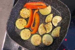 4. Verhit een beetje olijfolie in de koekenpan en bak de groenten een paar minuten. Breng op smaak met Italiaanse kruiden, peper en zout.