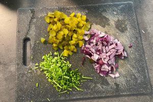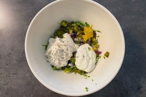 3. Snijd in de tussentijd de augurkjes in stukjes, de rode ui in kleine blokjes en hak de verse bieslook fijn. Doe het in een kom en voeg citroensap, vegan mayonaise, sojayoghurt, mosterd en knoflookpoeder toe. Mix alles goed door elkaar met een lepel.