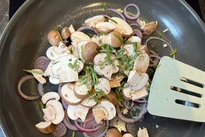 4. Verhit olijfolie in een pan en fruit hierin de ui en knoflook aan. Voeg de champignons, rozemarijn en een snuf zout en peper toe.