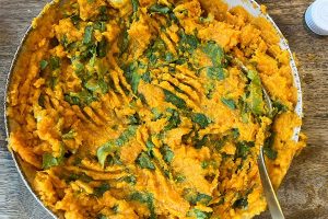 5. Haal de zoete aardappel uit de oven haal uit de schil en prak fijn met een vork of stamper.