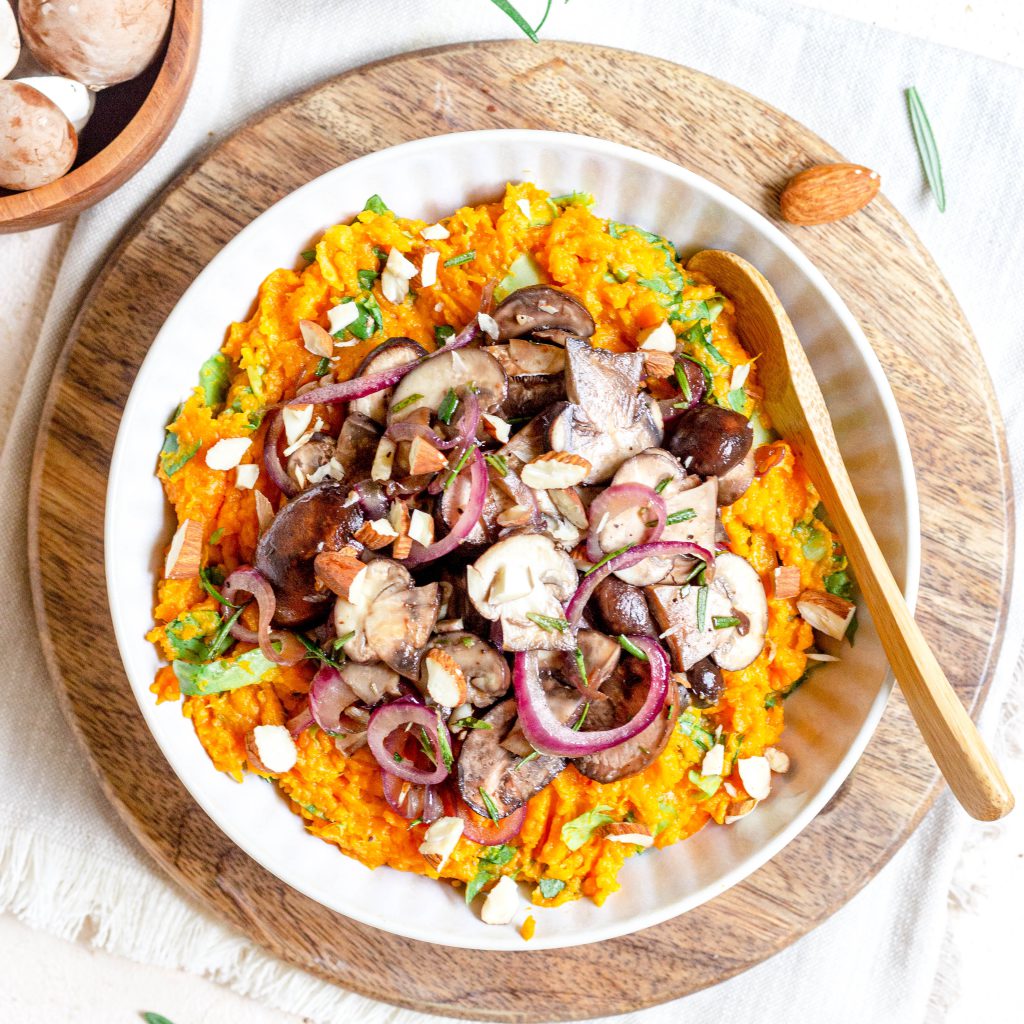 7. Serveer op een bord en doe boven op de stamp de gebakken champignons met rode ui.