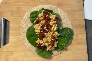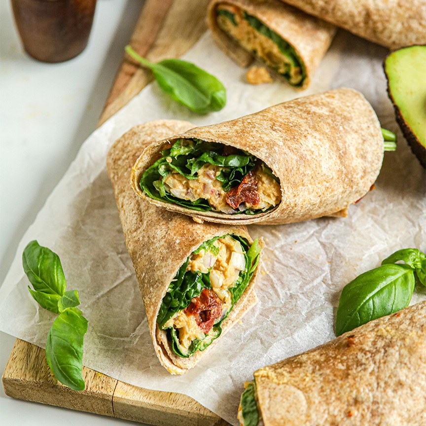 4. Beleg de volkoren wraps met verse spinazie en verdeel hier de kikkererwtensalade overheen.