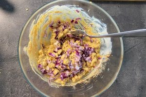 3. Snipper de rode ui en schep deze door de kikkererwtensalade.