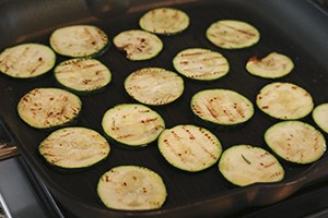 2. Snijd de courgette in plakjes en de paprika in reepjes. Bestrijk deze met een beetje olijfolie en grill in een grillpan totdat ze mooie grillstreepjes hebben.