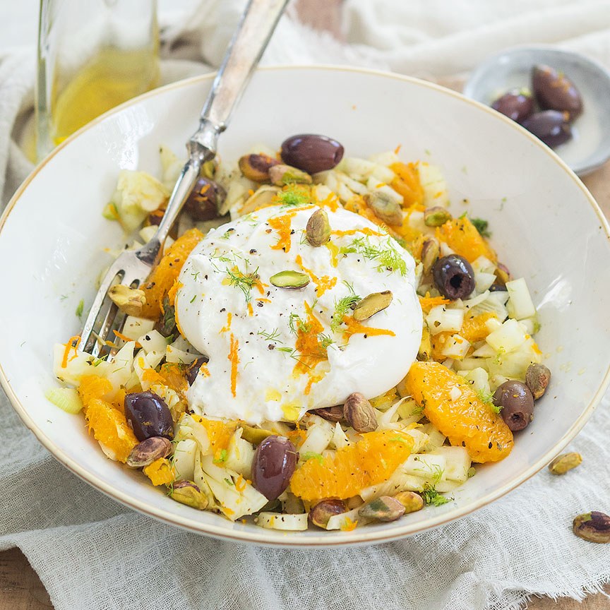 8. Leg de burrata in het midden van de salade en maak er met een mes een scheurtje in. Verdeel er nog wat extra olijfolie en zout en peper overheen.