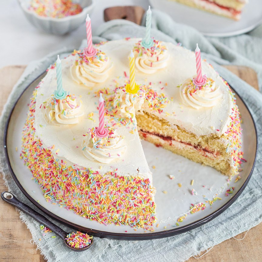 15. Tips: Dit is een basisversie van de verjaardagstaart. Je kunt ook de taart in 2 lagen snijden en vullen. Of losgaan met decoratie zoals taarttoppers, bloemen, figuren of kleurstof in de botercrème toevoegen voor een kleurrijk effect.