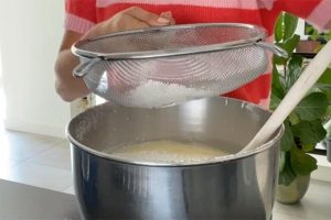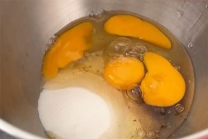 3. Leg de eieren van tevoren 5 minuten in warm water (niet te heet) en mix ze daarna samen met de suiker en vanillesuiker 10 minuten tot luchtig en schuimig.