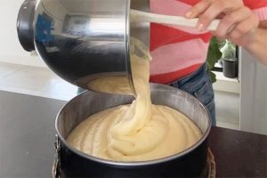 5. Verwarm nu de oven naar 180° graden en bak de biscuittaart in ca. 35 tot 40 minuten gaar. Trek als de tijd voorbij is niet in 1 x de ovendeur open maar zet hem eerst even op een kiertje zodat de taart minder snel inzakt en rustig kan afkoelen. Haal hem daarna uit de oven en laat compleet afkoelen.