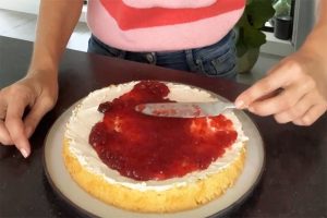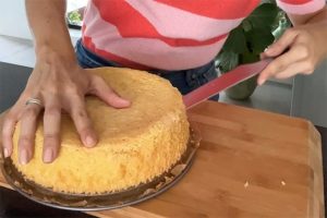 7. Snijd de biscuittaart met een groot scherp mes horizontaal recht doormidden en klap open.