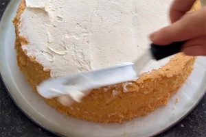 11. Zet de taart op een plat bord of taarthouder. Besmeer de zijkanten en de bovenzijde ook met een laagje botercrème (bewaar een beetje crème voor de toefjes).