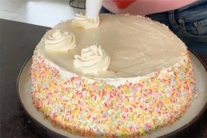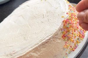 12. Bestrooi de zijkant met de gekleurde sprinkles. Dit kun je met een lepel doen of door de taart iets schuin te houden en de zijkant te bestrooien.