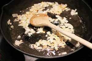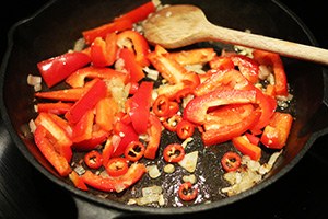 1. Snipper de ui, knoflook en rode peper en fruit deze aan in een grote pan met een eetlepel olijfolie.