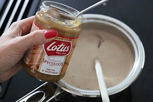 1. Verhit de melk in een pannetje. Voeg de chocolade in stukjes toe en laat al roerend smelten. Voeg het cacao poeder, kaneel en Speculoos pasta toe en laat ook door de melk opnemen.