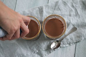 2. Roer eventueel een keer goed met een garde door om klontjes te voorkomen. Giet de melk in glazen en spuit er een toef slagroom op. Garneer wat kruimels speculaas en een snufje kaneel.