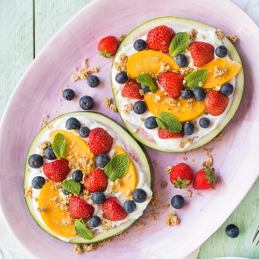 Lekkere frisse en zomerse snack of traktatie van een plak watermeloen belegd met fruit en yoghurt.