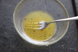 1. Meng de ingrediënten voor de dressing door elkaar. Snij de watermeloen in stukken (verwijder eventueel de zaadjes). Snijd ook de tomaten en perziken (of nectarines) in partjes. Halveer de avocado, verwijder de pit en schil en snijd in stukjes.