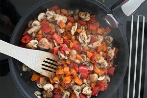 3. Verhit wat olie in een grote wok of hapjespan. Bak hierin de gesneden groenten samen met wat tijm en oregano. Doe dit 5 minuten op hoog vuur en roer regelmatig door.