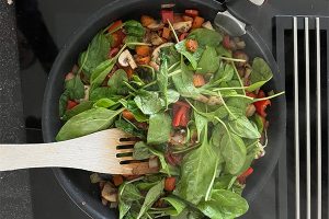 4. Snij ondertussen de gedroogde tomaten in kleine stukjes. Voeg de gedroogde tomaten en spinazie toe aan de pan en bak dit 2 minuten mee, tot de spinazie slinkt. Haal overtollig vocht uit de pan als dat nodig is.