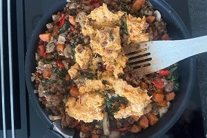 5. Snijd of kruimel wat feta in blokjes. Meng de feta, kruimig gehakt en de zoeteaardappelpuree door de groenten tot één massa.