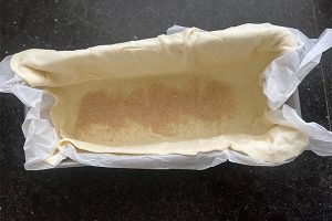 7. Rol het bladerdeeg ietsjes groter uit. Leg het deeg met het bakpapier in de cakevorm en zorg dat het overige deeg de vulling kan bedekken.