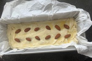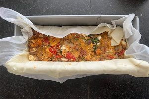 8. Schep de groentevulling in de cakevorm, het kan zijn dat je er een beetje over houd. Vouw het bladerdeeg over de vulling en druk iets aan. Zorg dat alle kanten en naden goed dicht zijn. Smeer de bovenkant in met wat van het losgeklopte eitje. Decoreer eventueel met amandelen, sesam en/of maanzaad.