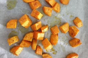 3. Was de zoete aardappelen goed, schil indien nodig en snijd in blokjes. Leg ze op een bakplaat met bakpapier of in een ovenschaal. Verdeel er wat olie, ras al hanout kruiden en zout en peper overheen en zet ze voor 15-20 minuten in de oven. Hussel halverwege een keer door. Zet de oven uit als ze klaar zijn en laat ze in de oven staan, zodat ze warm blijven totdat je ze gaat serveren.