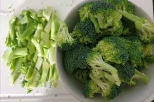 4. Snijd ondertussen de roosjes van de broccoli en snijd daarna de stam in kleine stukjes.