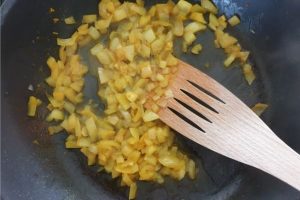 6. Snijd de uien fijn en bak deze met de kurkuma en zwarte peper op een laag vuur. Voeg na een paar minuten de witte wijnazijn toe.