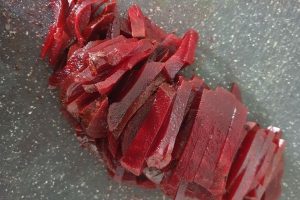 8. Heb je gekozen voor de voorgekookte bieten? Snijd deze dan in stukjes.