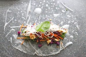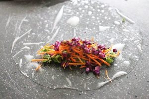2. Leg dan op een ondergrond en verdeel een beetje boerenkool, peen julienne, rode kool en noedels in het midden iets meer naar je toe. Verdeel een blaadje munt en wat walnoten er over. Sla de korte zijde over de vulling en vouw dan de zijkanten naar binnen over de vulling. Rol hem verder op. Herhaal dit ook met de rest van de ingrediënten. Bestrooi de winter rolls met wat sesam en serveer met de zoetzure saus.
