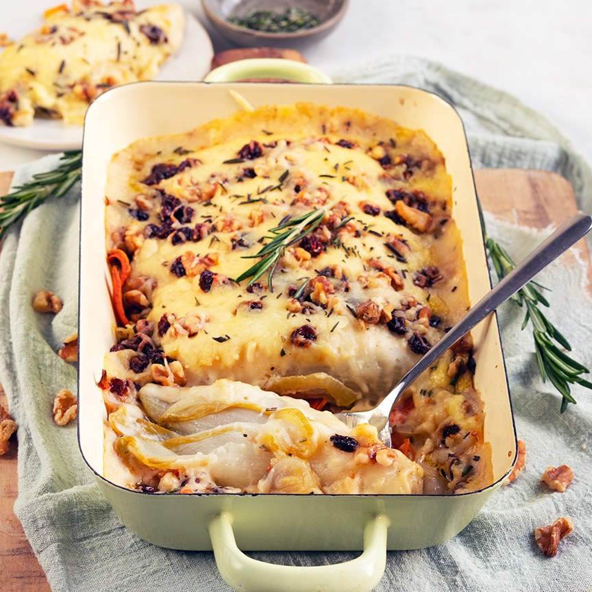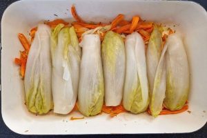 14. Haal de ovenschaal uit de oven en verdeel de witlof eroverheen.