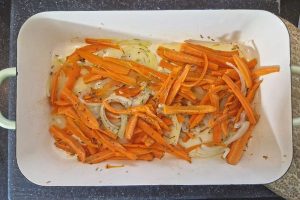 5. Verdeel de ui en wortel over de schaal en bestrooi met zout, peper en gedroogde rozemarijn.