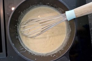 11. Schenk daarna de melk zachtjes in de pan terwijl je blijft roeren.