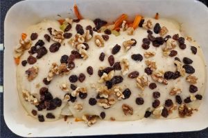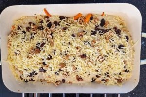 16. Strooi de rozijnen en de walnoten in stukjes eroverheen en bestrooi daarna met geraspte kaas.