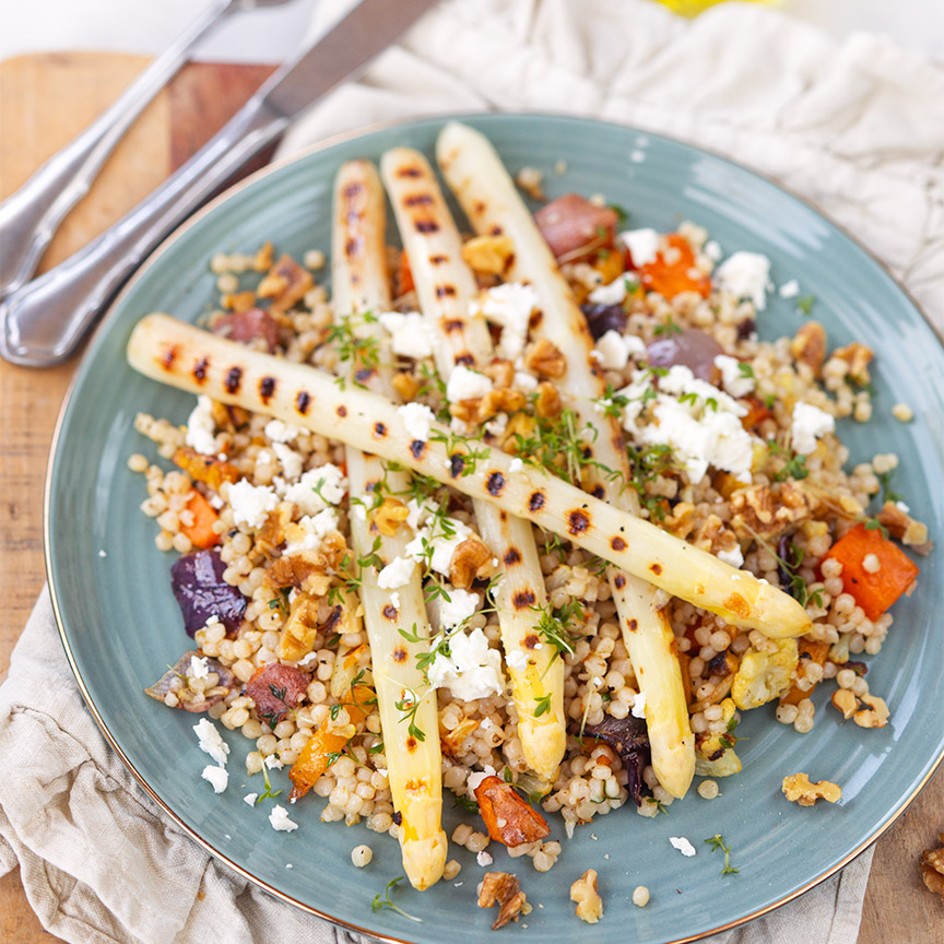 7. Verdeel de couscous over de borden. Leg de gegrilde witte asperges erop en verkruimel de feta erover. Strooi tot slot de walnoten over het gerecht voor een lekkere crunch.