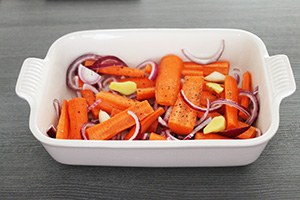 1. Week de cashewnoten een nacht van te voren of 30 minuten in kokend water. Verwarm de oven voor op 200 graden. Neem een ovenschaal en voeg hier de wortelen in stukjes, de ui in ringen, de tenen knoflook en het stukje gember aan toe. Besprenkel met wat olijfolie en peper en zout. Zet ongeveer 35 minuten in de oven of tot de zacht en een beetje bruin gekleurd zijn.