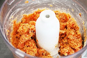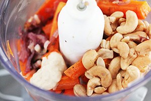 2. Neem de keukenmachine en voeg hierin de hele inhoud van de ovenschaal. Voeg hier de cashewnoten aan toe met tahin en citroensap. Blend dit tot een mengsel met kleine stukjes. Er kan eventueel extra olijfolie aan toegevoegd worden om de spread smeuïger te maken. Serveer de wortel spread op crackers met plakjes komkommer en alfalfa.