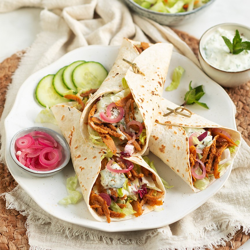 3. Beleg de wraps met een handje sla en schep de gyros erop. Schep er lekker wat tzatziki op en verdeel er wat ingelegde rode ui over.