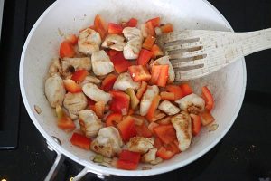 1. Hak de ui fijn en bak deze samen met het de kip ongeveer 5 min. in een pan.