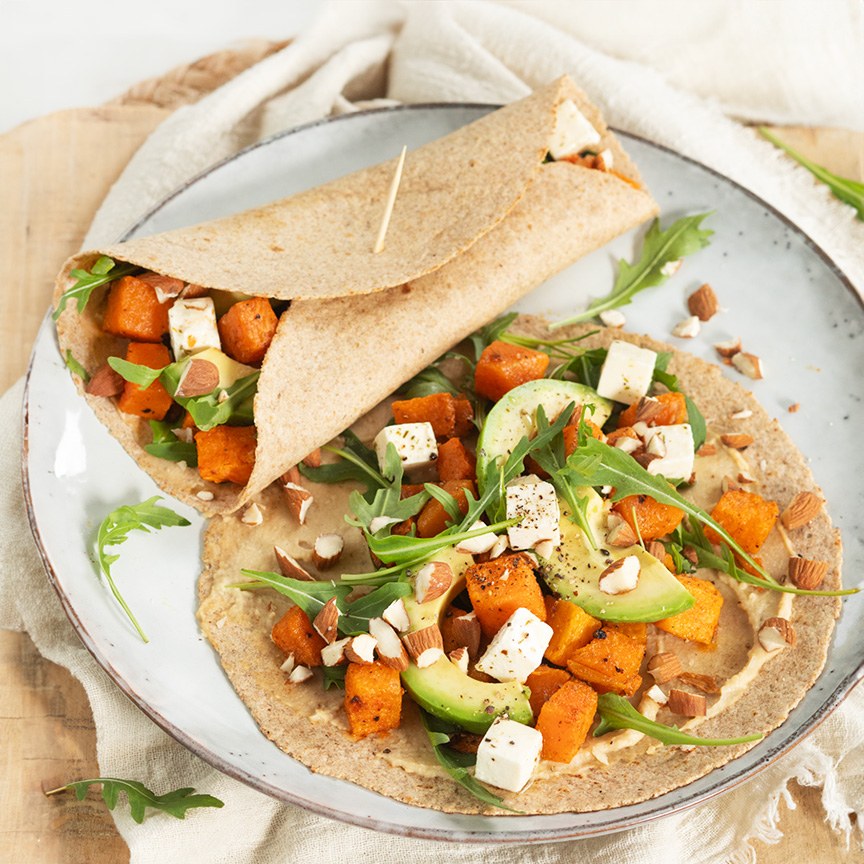 5. Besmeer de tortilla wraps met een laagje hummus. Verdeel hier de sla, geroosterde pompoenblokjes, plakjes avocado, blokjes feta en amandelen over.