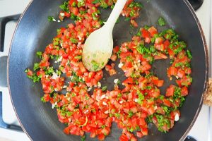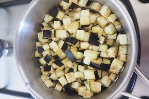 1. Was de aubergine en snijd in blokjes. Doe deze in een pan met water en een snufje zout en laat 15 minuten zachtjes koken. Giet de aubergine af en laat goed uitlekken. Snijd ondertussen de teentjes knoflook, verse peterselie en koriander fijn. Was de tomaten en verwijder de zaadlijsten. Snijd de tomaten in blokjes.