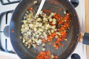 2. Verhit de olie in een pan en bak hierin de knoflook, peterselie, koriander en tomaat. Voeg vervolgens het paprikapoeder en de komijn toe en laat dit circa 5 minuten bakken. Doe vervolgens de aubergineblokjes erbij en zet het vuur laag. Laat het geheel ongeveer 20 minuten zachtjes garen. Voeg eventueel wat water toe aan de pan als deze te droog wordt. Prak vervolgens met een vork de zaalouk fijn.