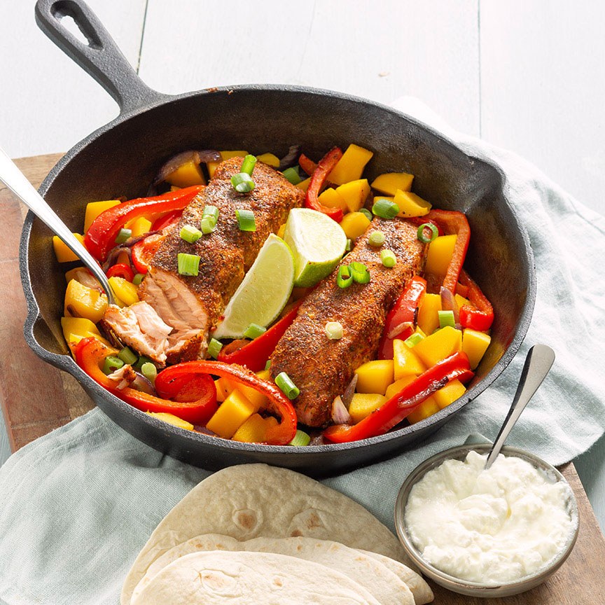 2. De zalm mag nog een beetje rosé zijn van binnen. Hak de bosui in ringetjes en verdeel over het pannetje met zalm. Verwarm ondertussen de wraps en doe de zure room in een kommetje. Serveer het pannetje met paprika, ui en de gekruide zalm met de wraps en mango. Gebruik het limoentje om de zalm mee te besprenkelen. Ook lekker met jalapeno pepers en/of avocado. Ook lekker met zelfgemaakte guacamole.